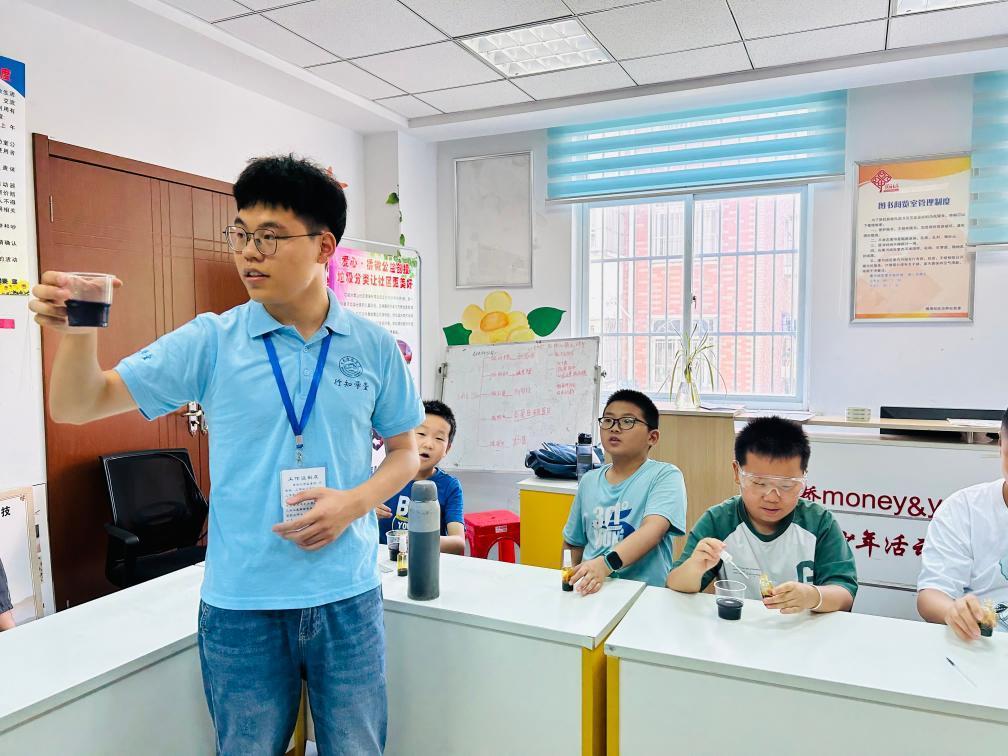 走进安徽省合肥市方桥社居委新时代文明实践站,记者看到华东理工大学化学工程与工艺专业学生、志愿者沈亮正在给暑托班授课。