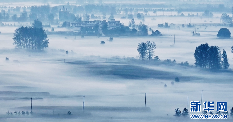 初秋时节,安徽省阜阳市蒙洼蓄洪区晨雾缭绕,村庄、田野、道路在轻纱薄雾氤氲下,若隐若现,如梦似幻。新华网发(周辉 摄)