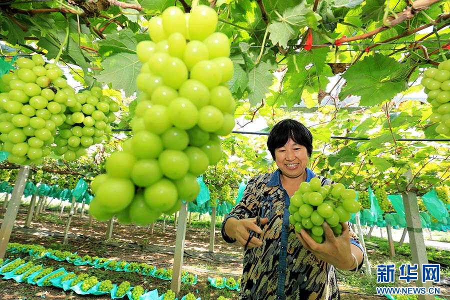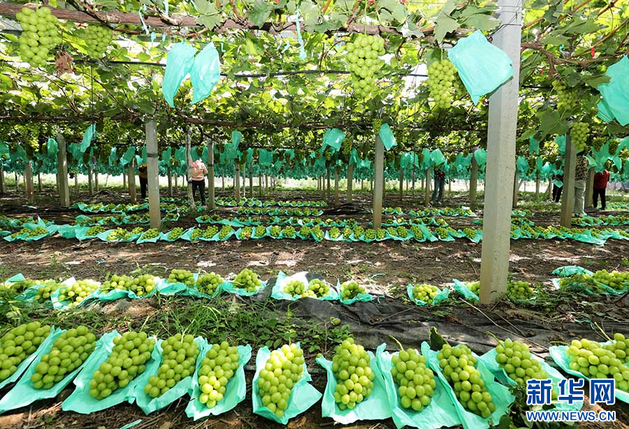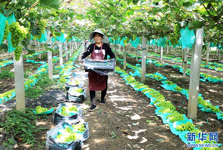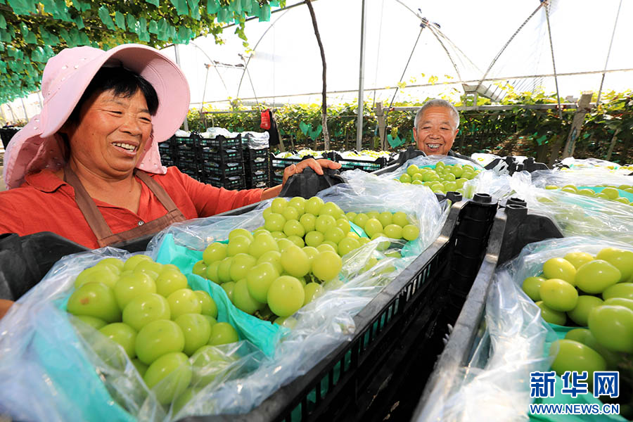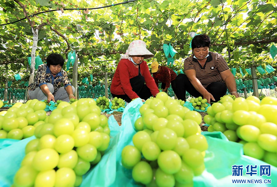 金秋时节,在安徽省淮北市杜集区南山村葡萄种植基地,一串串晶莹透亮的葡萄挂满枝头,村民正忙着采摘、整理、装箱,一派丰收忙碌景象。新华网发(李鑫 摄)