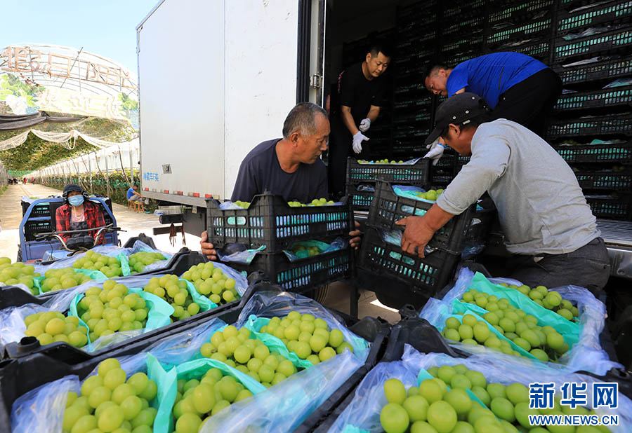 近日,在安徽省淮北市杜集区南山村葡萄种植基地,村民正忙着采摘葡萄装车外销。