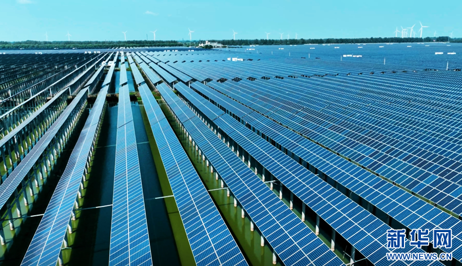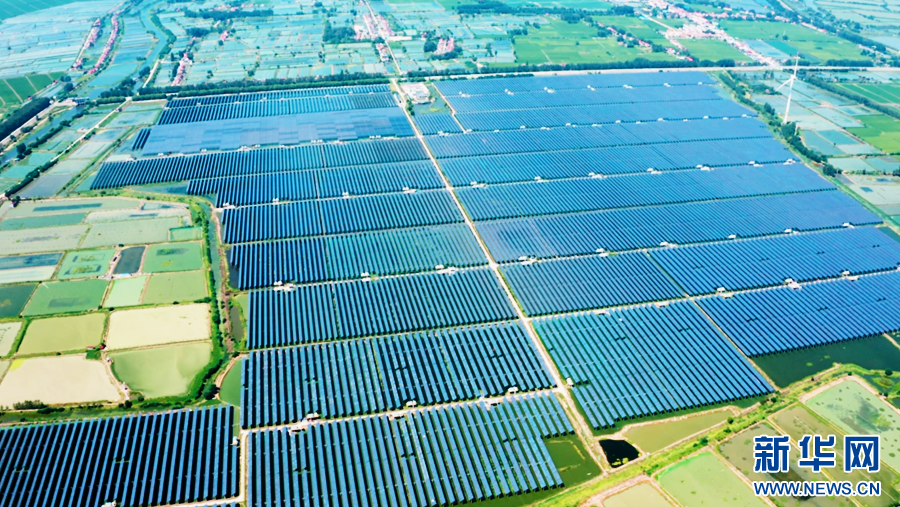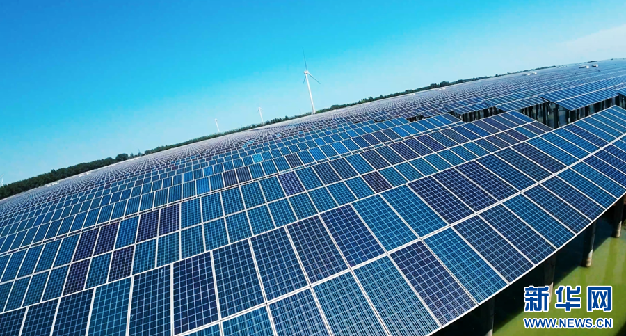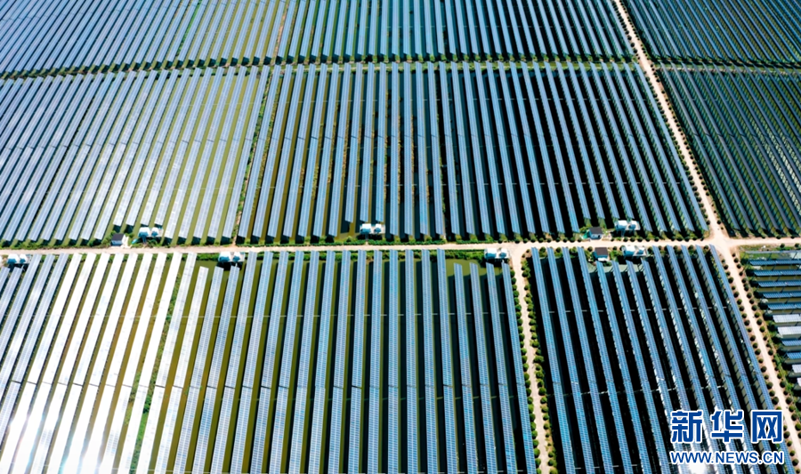 秋日时节,在安徽省滁州市天长市杨村镇东大圩,一排排光伏发电板架设在水面上,与田野相互映衬,构成一幅美丽的生态画卷。“渔光互补”光伏电站上层用于光伏发电,下层用于水产养殖,实现生态效益、经济效益的有机统一。
