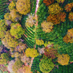 近日,在安徽省安庆市岳西县响肠镇千佛塔村千亩茶园,树木色彩斑斓,美不胜收。