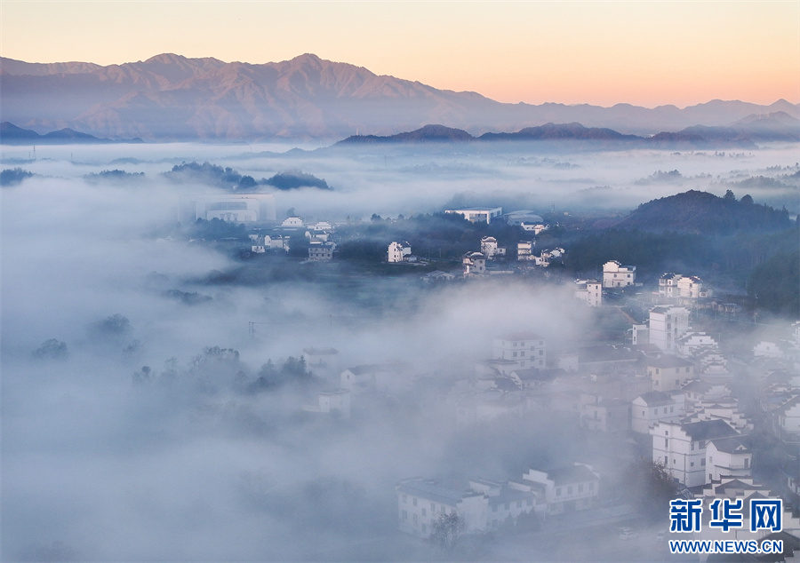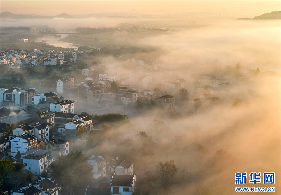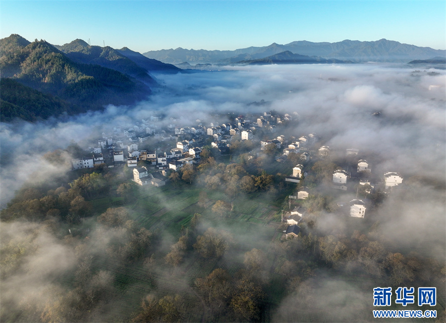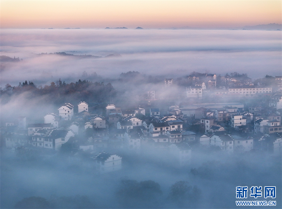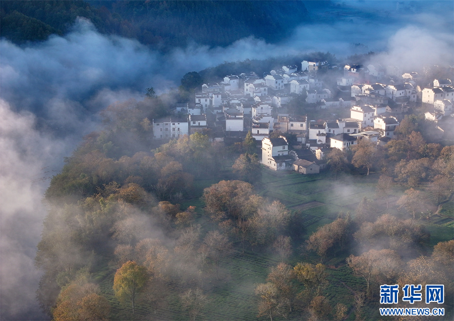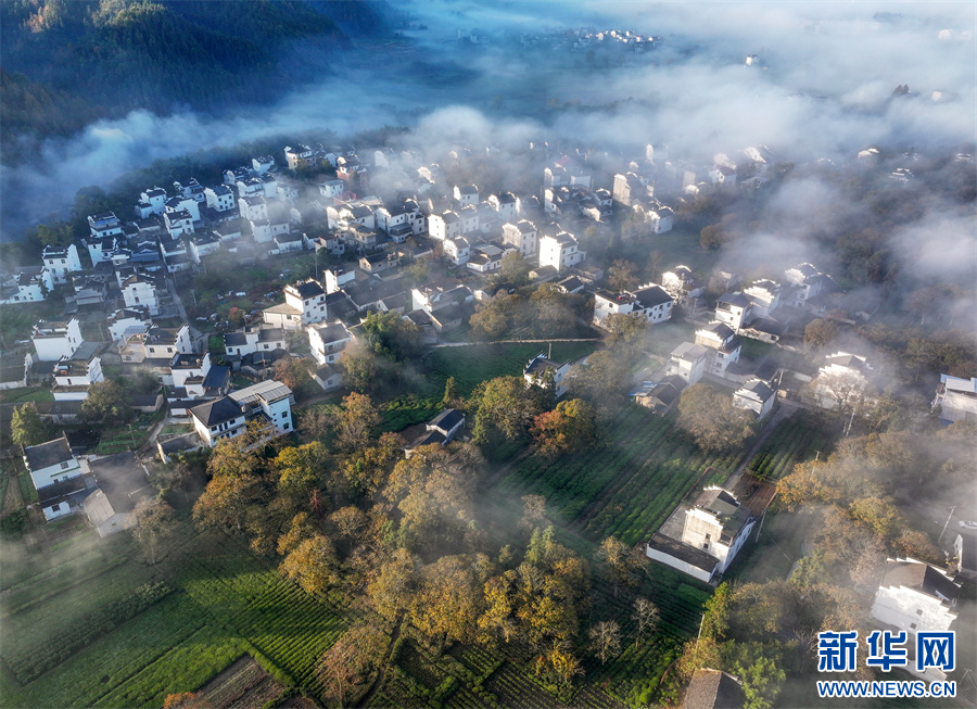 当日清晨,安徽省黄山市休宁县商山镇溪州村晨雾飘渺,鳞次栉比的徽派建筑掩映其间,若隐若现,如梦似幻。新华网发(施亚磊 摄)