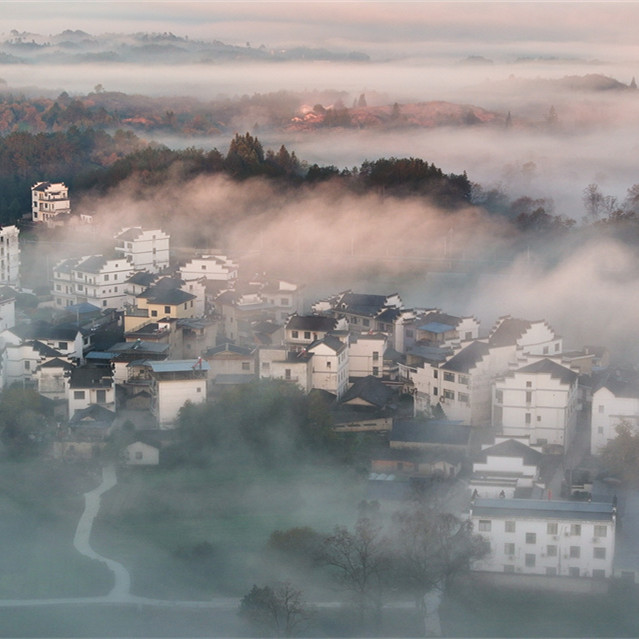 11月21日,在安徽省黄山市休宁县商山镇溪州村拍摄的冬日旖旎晨景。(无人机照片)