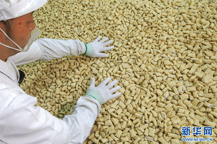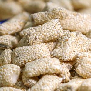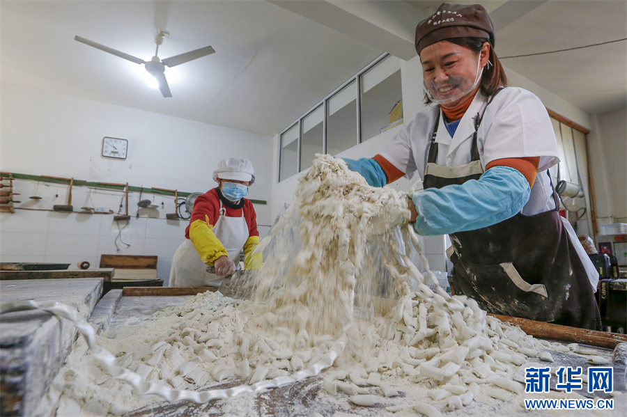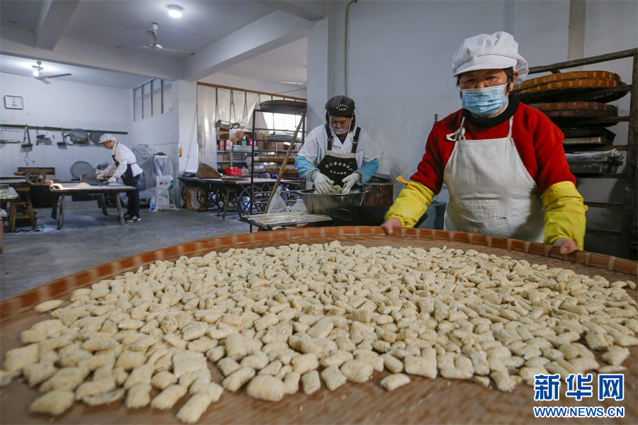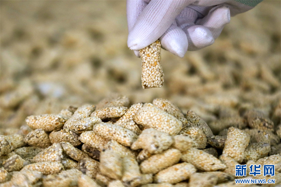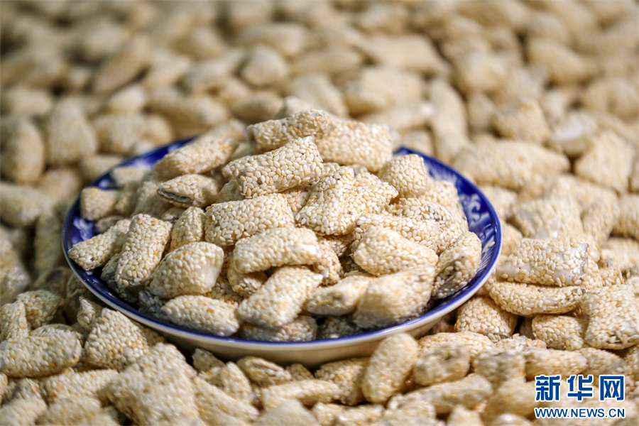 进入冬季,在安徽省黄山市休宁县东临溪镇,制糖手艺人岑中华一家开始忙着制作“寸金糖”。寸金糖是徽州地区名点,蔗糖加热经塑形、断条、上芝麻、摊放等手工工序,制成约1寸长的金黄色小条,“寸金”之名是由此形象而来。寸金糖内有夹心,外裹芝麻,口味香甜绵长,深受顾客喜爱。新华网发(施亚磊 摄)