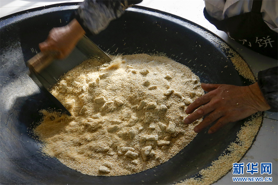 近日,安徽省黄山市休宁县东临溪镇,制糖手艺人给糖上芝麻。