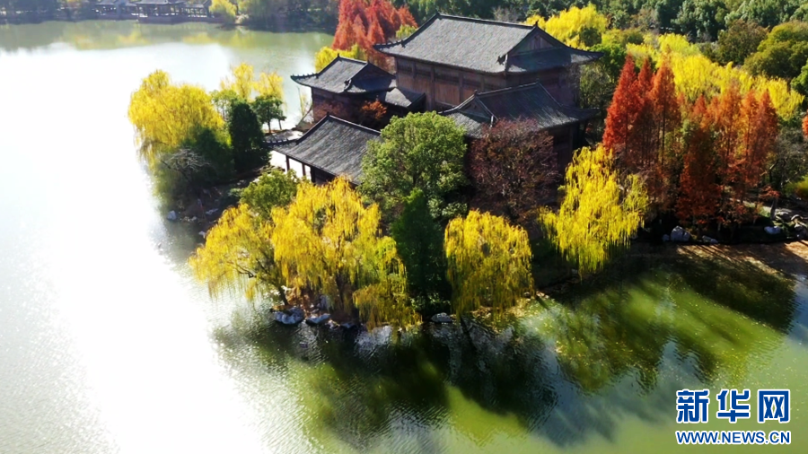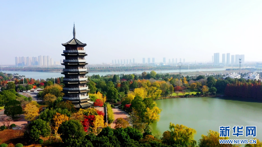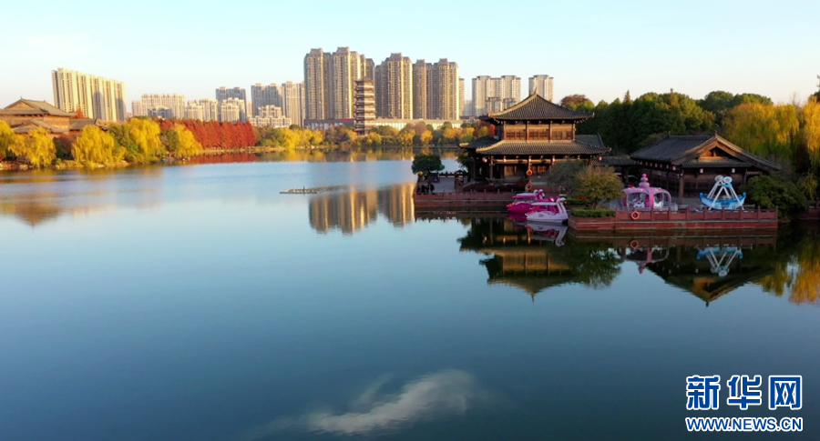 近日,在“皖北水乡”阜阳市颍上县,高空俯瞰滨河公园,色彩斑斓,静谧如画。蓝天碧水与树木倒影相映成趣,绘成一幅美丽的水彩画卷。新华网发(徐红梅 摄)