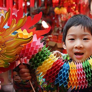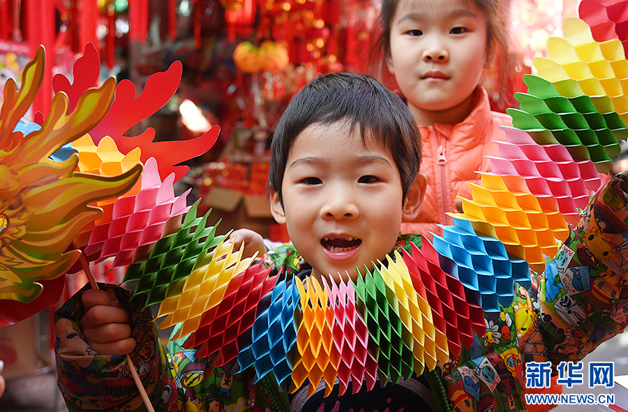 1月13日,合肥市城隍庙小商品市场,孩子展示购买的龙年饰品。