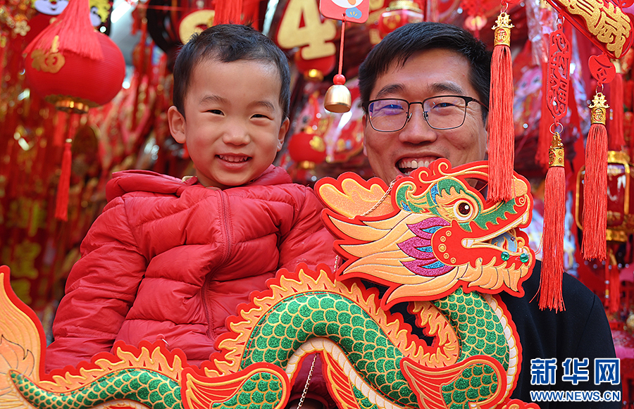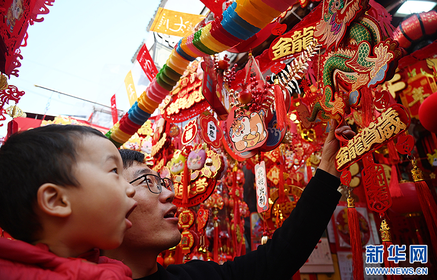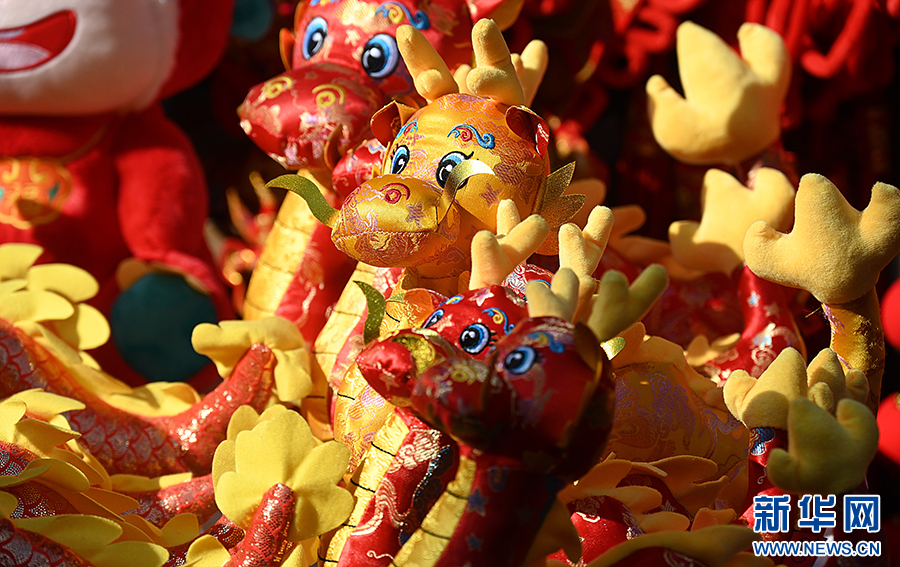 随着龙年春节的临近,在安徽省合肥市城隍庙小商品市场,款式多样的“龙元素”福字、春联、玩偶等新年饰品琳琅满目,节日氛围浓郁,吸引不少市民驻足选购。新华网发(杨晓原 摄)