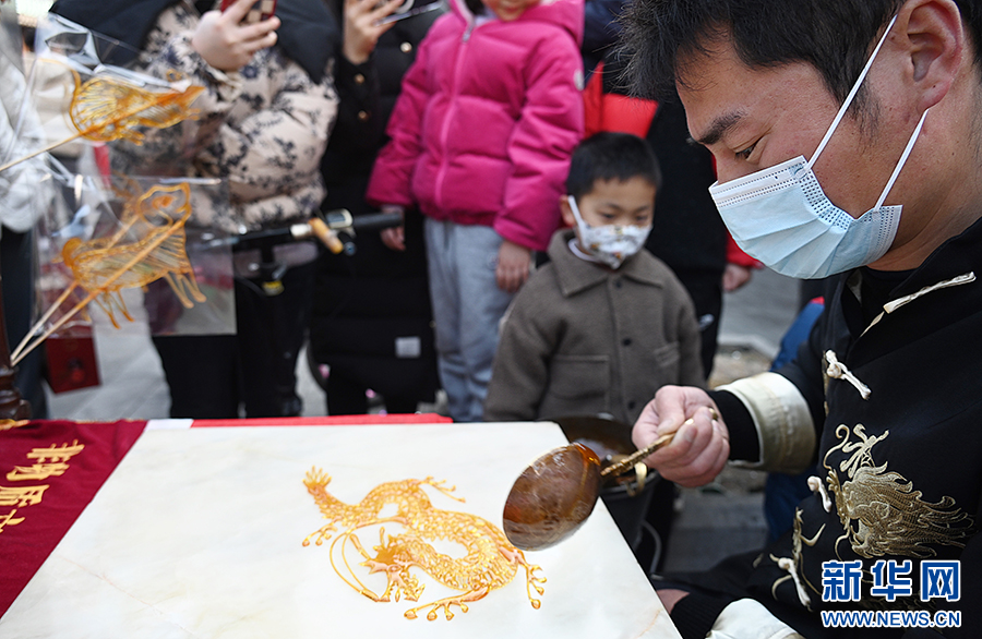 1月13日,合肥市城隍庙小商品市场,非遗艺人现场制售龙形糖画。