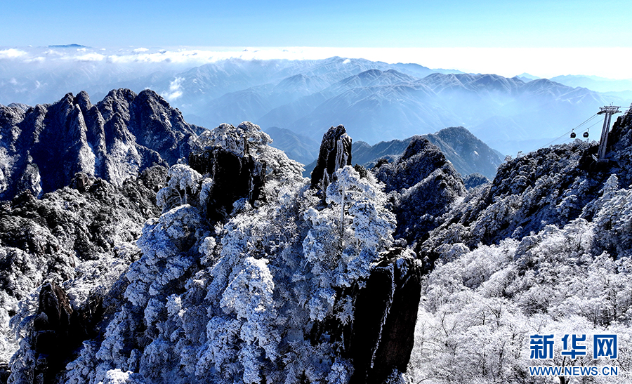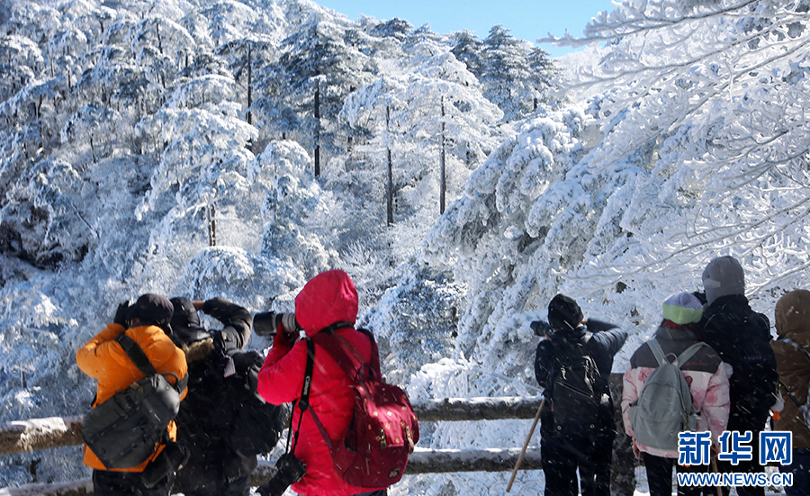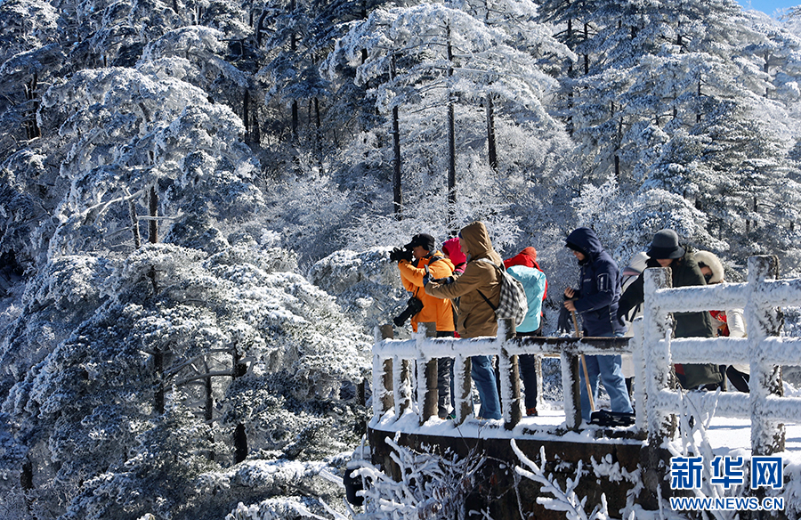 当日,安徽黄山风景区雪后初霁。放眼望去,峰峦银装素裹,雾凇晶莹剔透,与奇松怪石相映成趣,别有一番韵味,引得游客驻足欣赏,摄影留念。新华网发(潘成 摄)