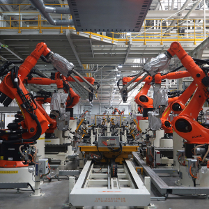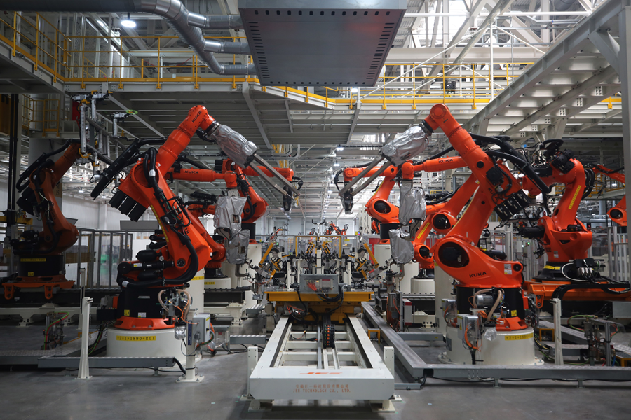 安徽合肥拍摄的大众安徽模块化电驱动平台工厂车身车间一角。新华社记者 杜潇逸 摄