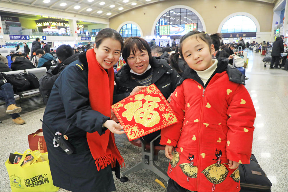 湖北武汉汉口火车站工作人员为候车旅客送“福”字(2月2日摄)。新华社发(邱晟 摄)