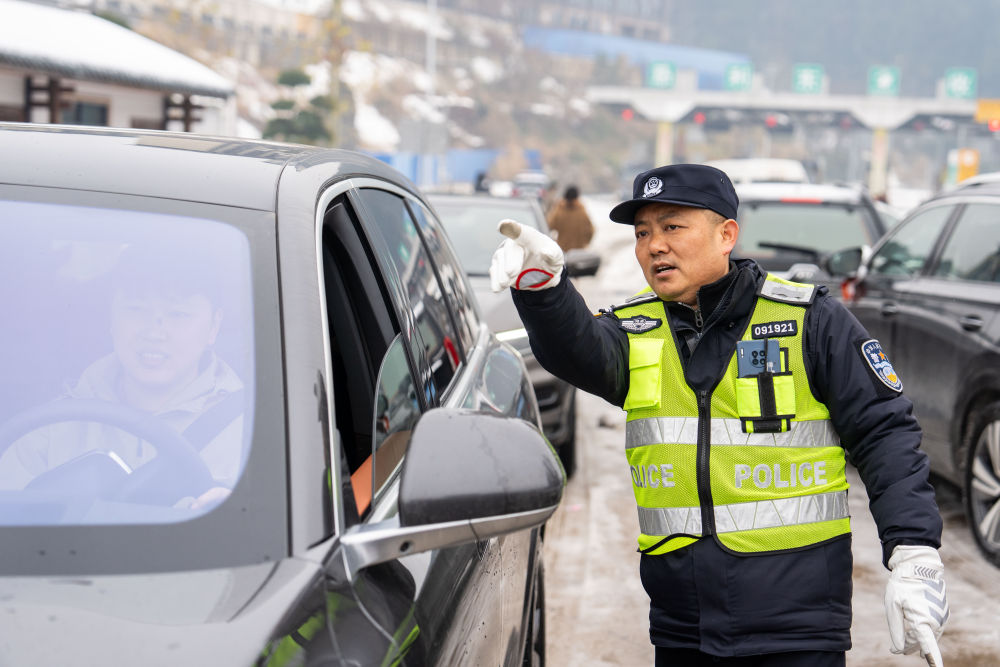 在湖南长张高速慈利东收费站附近,交警解答旅客的提问(2月6日摄)。新华社记者 陈思汗 摄