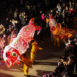 2月14日,游客在安徽省黄山市歙县四月乡村观看民俗舞龙展演(无人机照片)。