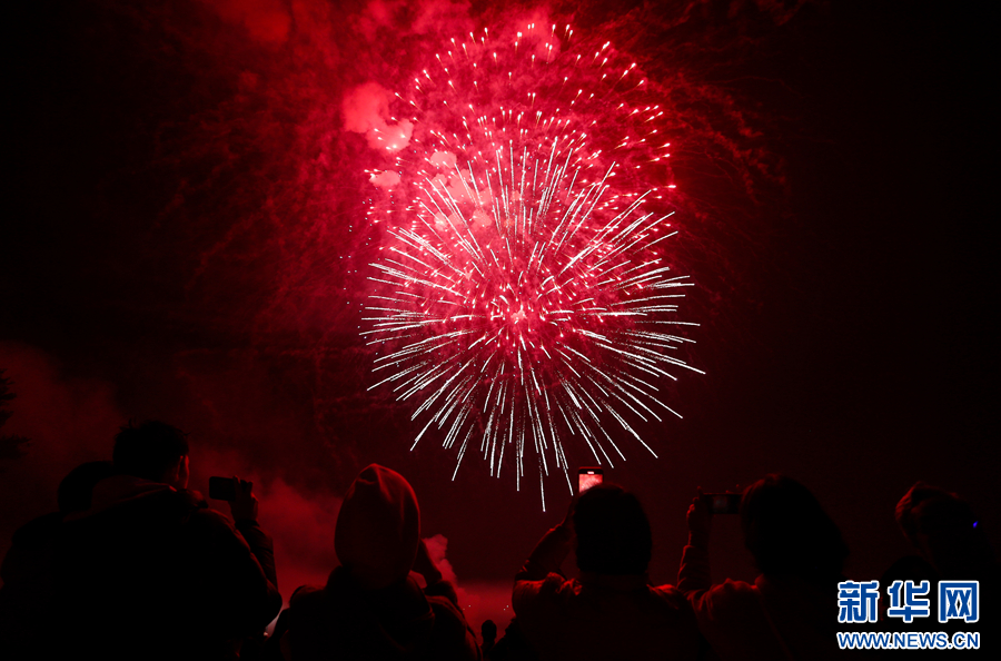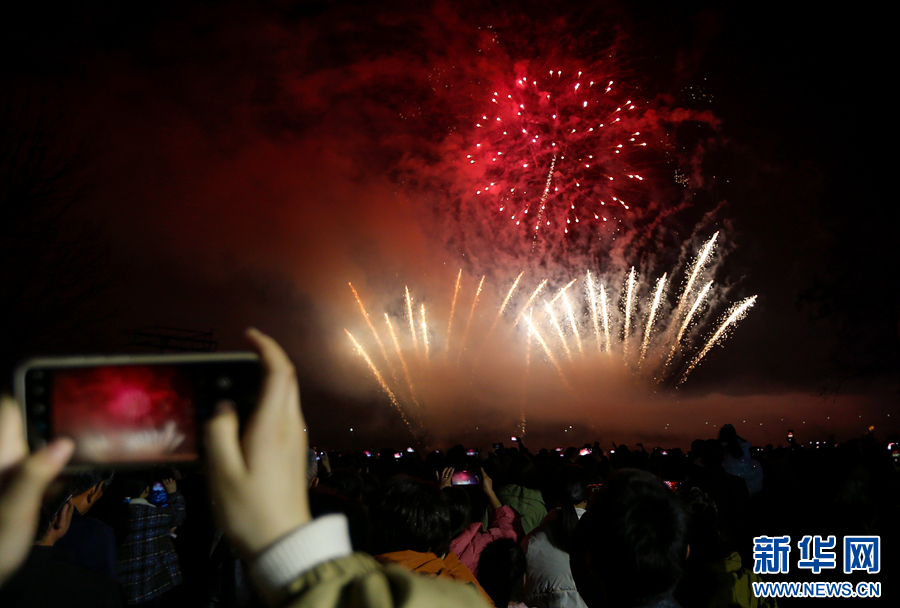 2月14日,游客在安徽省黄山市歙县四月乡村观看璀璨烟花秀。