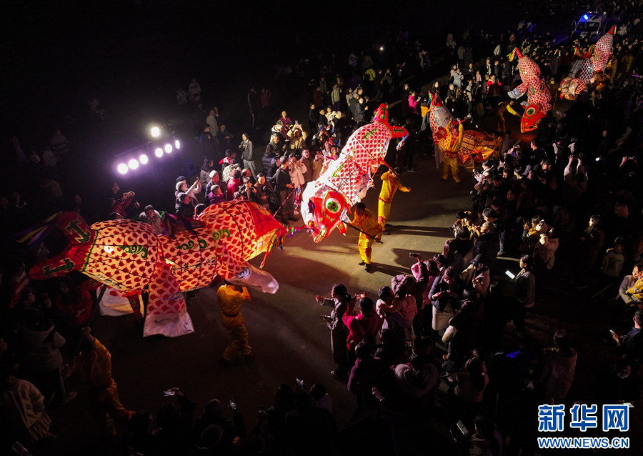 2月14日,游客在安徽省黄山市歙县四月乡村观看民俗鱼灯展演(无人机照片)。