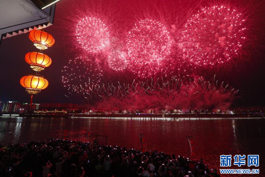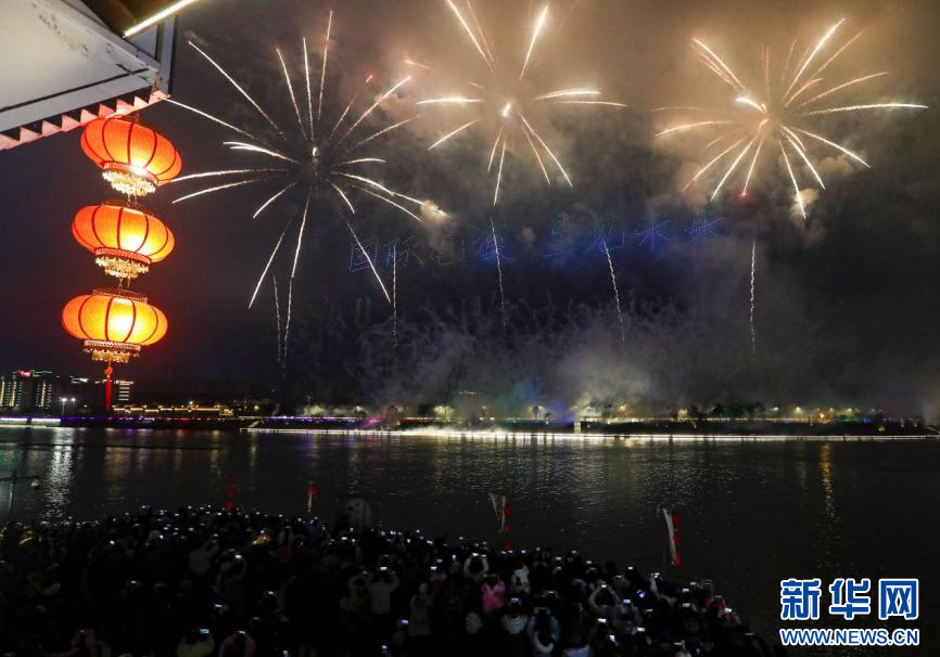 2月24日晚,众多市民游客在安徽省黄山市屯溪河街观赏焰火秀。