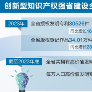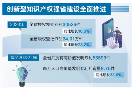 白皮书系统介绍了去年我省推进创新型知识产权强省建设取得的新进展、新成就。白皮书显示,我省去年推动高质量创造,增强创新发展新动能,全省授权发明专利30526件,同比增长16.6%。截至2023年底,全省共拥有高价值发明专利53593件,每万人口高价值发明专利拥有量8.75件,同比增长33.0%。全省有效注册商标量1323780件。2023年,全省版权登记作品34.01万件,同比增长28.2%,计算机软件著作权登记量再创新高,位列全国第九。新增地理标志保护产品1件、地理标志商标9件,总数分别达到86件、225件。新增植物新品种授权14件。
