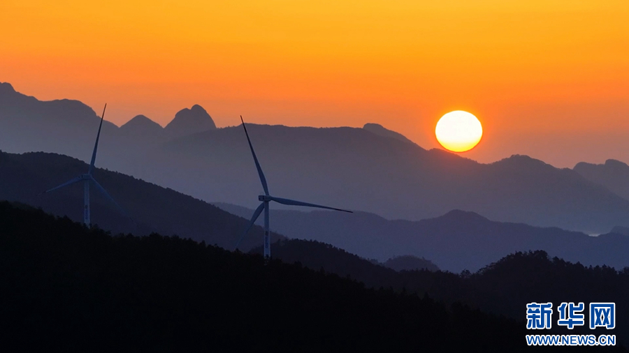 近日,在安徽省池州市东至县葛公镇红旗岭风电场,山巅耸立的风电机组与日出、朝霞、云海相映成景,共同绘就了一幅美丽的画卷。