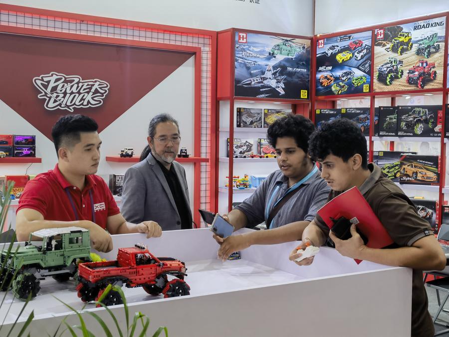 在第135届广交会第三期现场,采购商在广东信宇科技股份有限公司展位选购、体验积木遥控车产品(5月2日摄)。新华社记者 洪泽华 摄