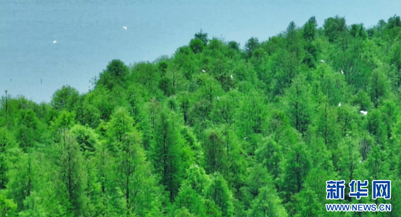 初夏时节,在安徽省怀宁县雷埠乡金鸡岭水库,2000多棵水杉青葱翠绿,引得众多鹭鸟前来“打卡”,构成一幅美丽的生态图画。