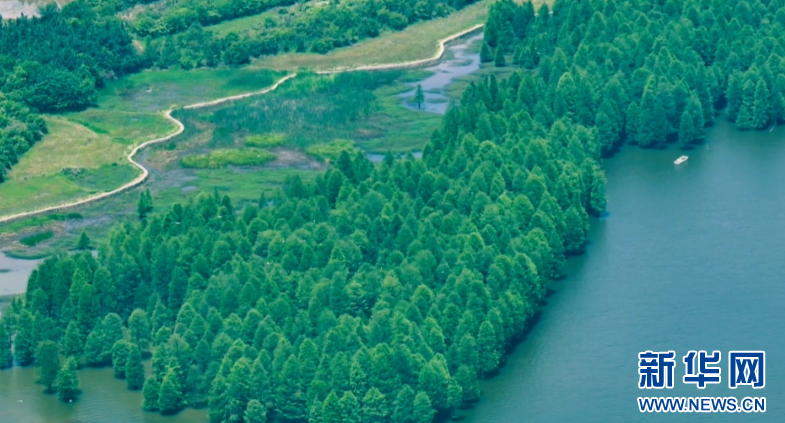 初夏时节,在安徽省怀宁县雷埠乡金鸡岭水库,2000多棵水杉青葱翠绿。