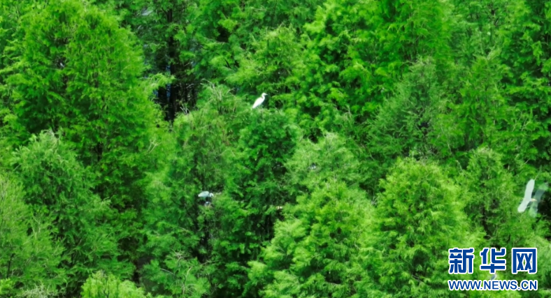 初夏时节,在安徽省怀宁县雷埠乡金鸡岭水库,2000多棵水杉青葱翠绿,引得众多鹭鸟前来“打卡”。