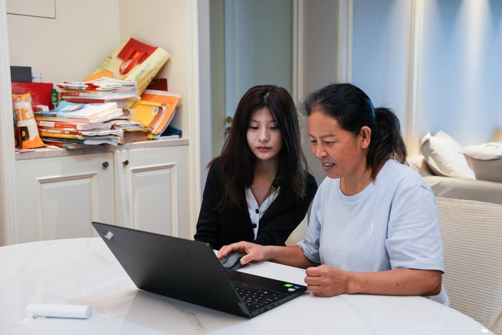 7月15日,郁晓楠和妈妈孙如奥在合肥的家中查询录取结果。新华社发(李福凯 摄)