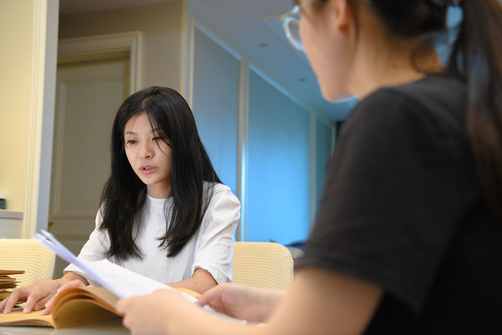 5月28日,在安徽合肥,一名大学生在给郁晓楠(左)辅导英语。新华社记者 张端 摄