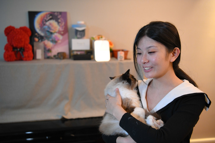 5月27日,在安徽合肥,郁晓楠和家里养的小猫互动。新华社记者 张端 摄