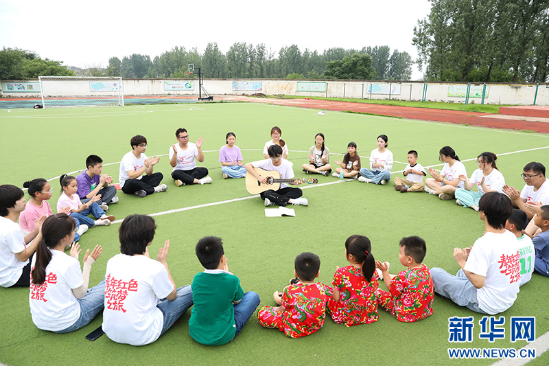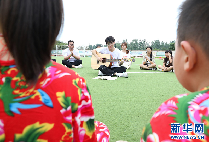 7月16日,在安徽省合肥市肥西县山南学区中心学校,一名大学生志愿者给孩子们弹奏吉他。