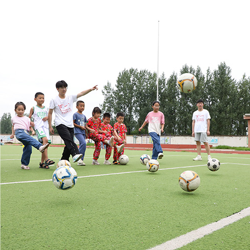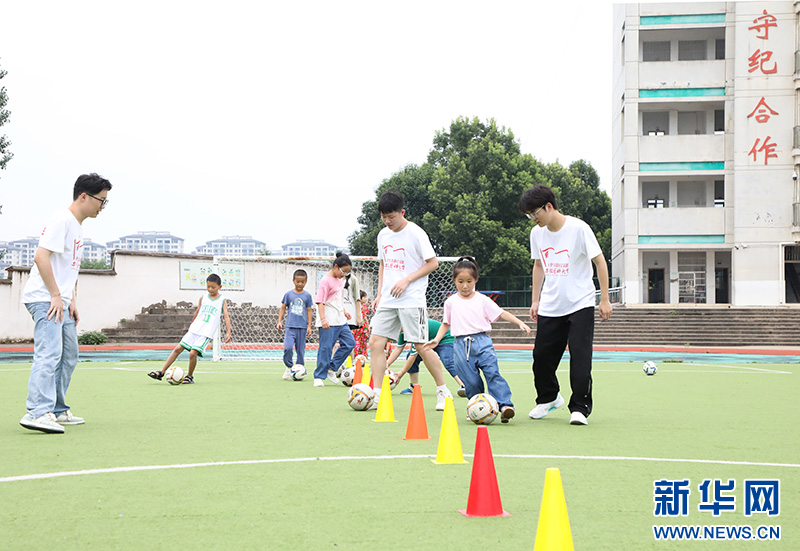 7月16日,在安徽省合肥市肥西县山南学区中心学校,大学生志愿者和孩子们一起踢足球。