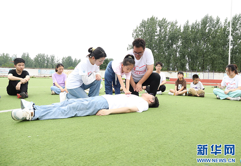 7月16日,在安徽省合肥市肥西县山南学区中心学校,大学生志愿者教授孩子们紧急心肺复苏方法。