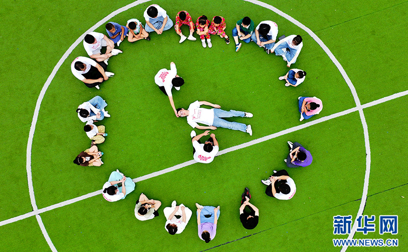7月16日,在安徽省合肥市肥西县山南学区中心学校,大学生志愿者教授孩子们紧急心肺复苏方法(无人机照片)。