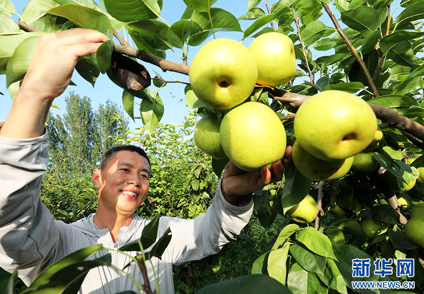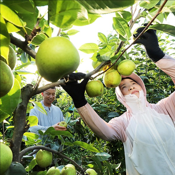 近日,安徽省淮北市烈山区烈山镇伟荣农场种植的“翠玉”等早熟梨陆续进入成熟期,工人们正忙着采摘。
