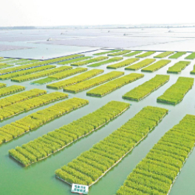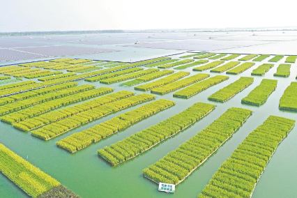 随着煤矿开采,淮南矿区沉陷区水域面积逐年扩大。如何在修复治理沉陷区水域生态的同时,把采煤沉陷区转变为可利用的耕地资源,成为企地近年来主攻的课题。为统筹协调煤炭资源开采与耕地保护的关系,拓宽采煤沉陷区综合治理与耕地保护相结合的有效路径,淮河能源控股集团与安徽理工大学等单位密切合作,在凤台县顾桥采煤沉陷区实施了“采煤地表沉陷区水面种植关键技术及模式研究与示范”项目,打造50亩“漂浮式稻田”。