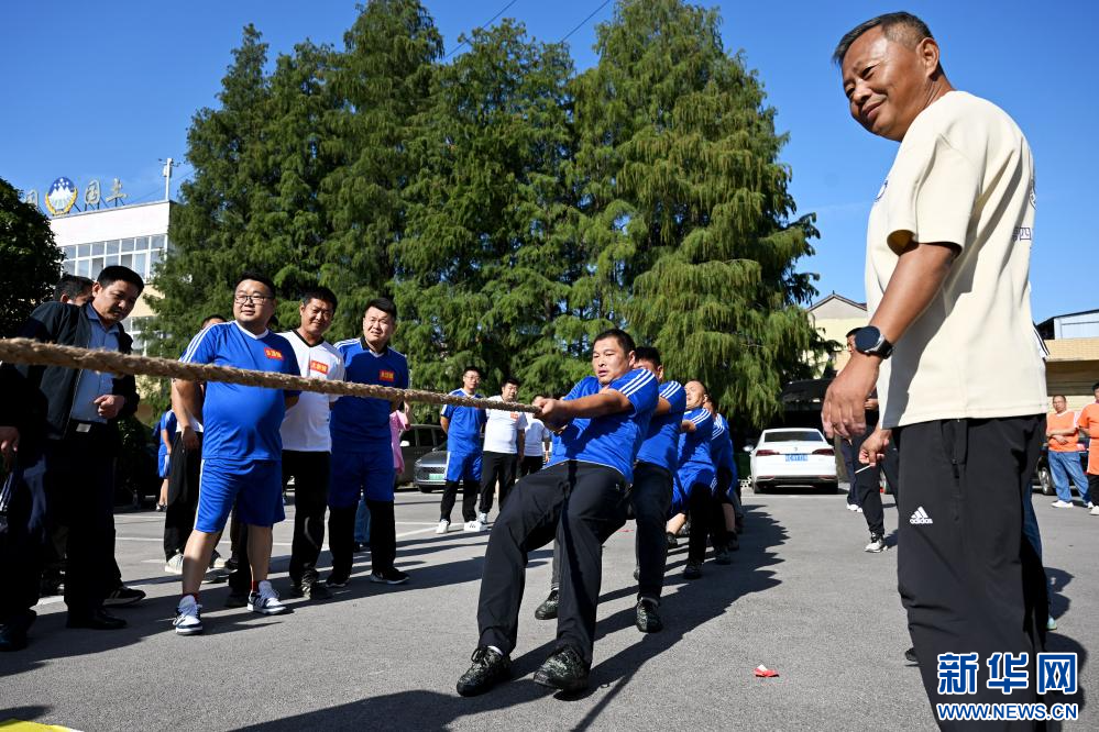 9月28日,人们在五河县沱湖乡参与丰收节拔河比赛。