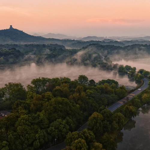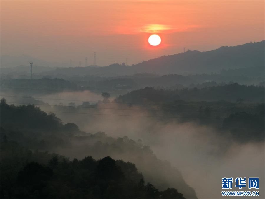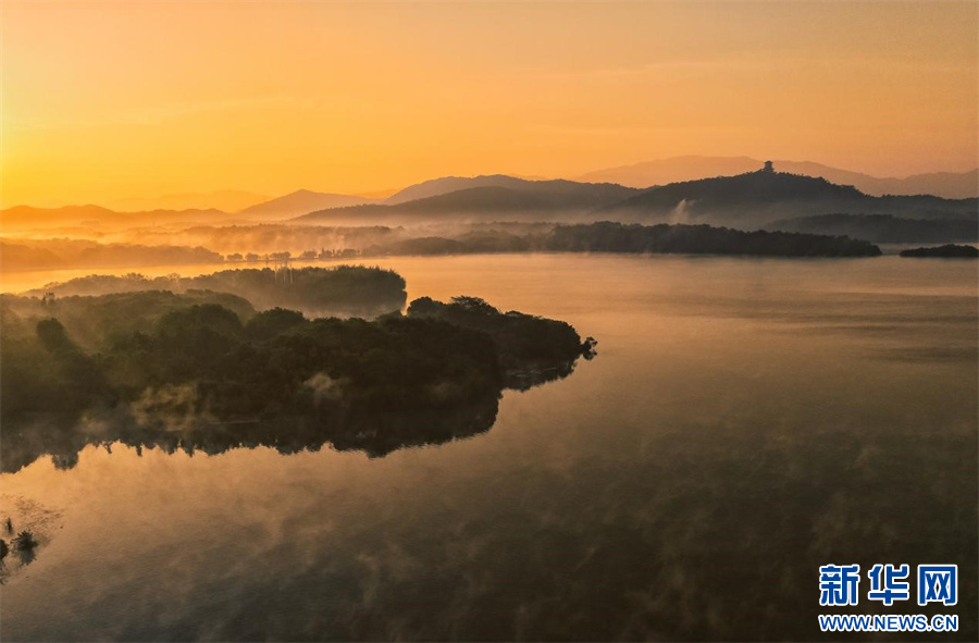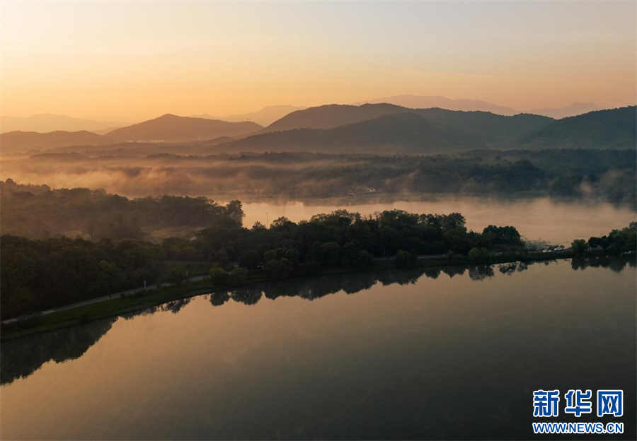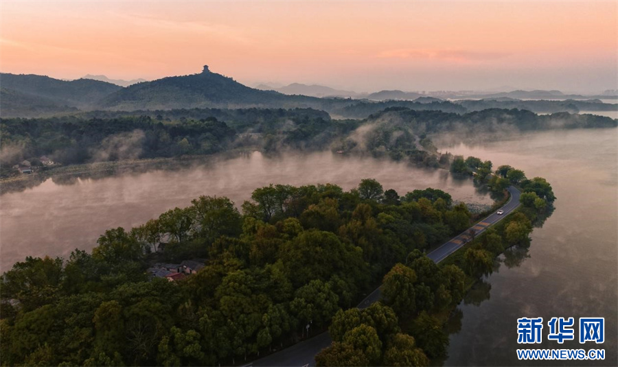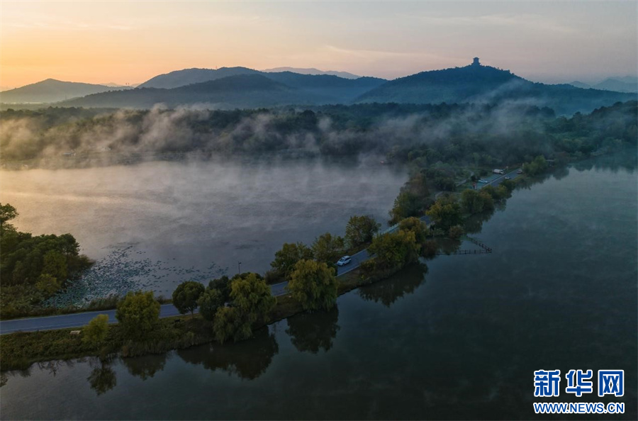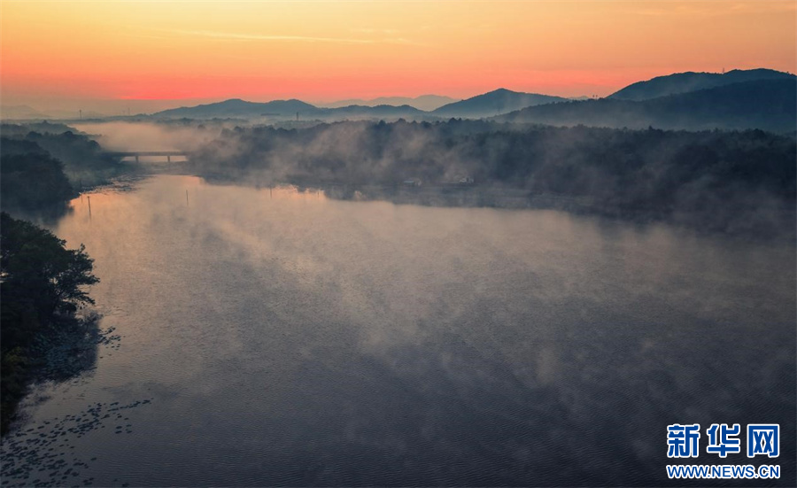 深秋时节,安徽省池州平天湖晨雾弥漫,远山如黛,道路、村落在晨雾中若隐若现,宛如水墨画卷。新华网发(李春 摄)