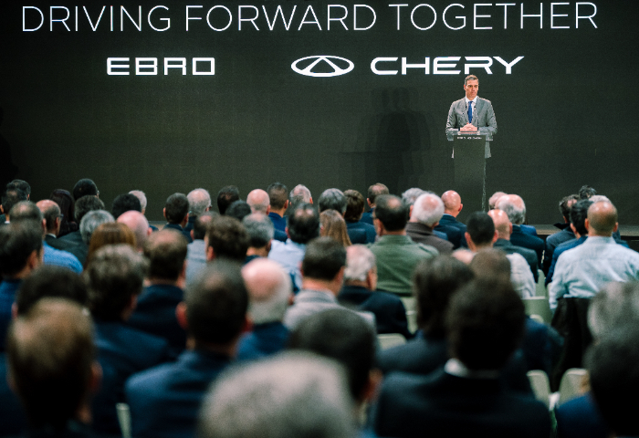 4月19日,在西班牙巴塞罗那自由贸易区,西班牙首相桑切斯出席中国奇瑞汽车公司与西班牙埃布罗公司电动汽车合作协议签字仪式时致辞。(新华社)