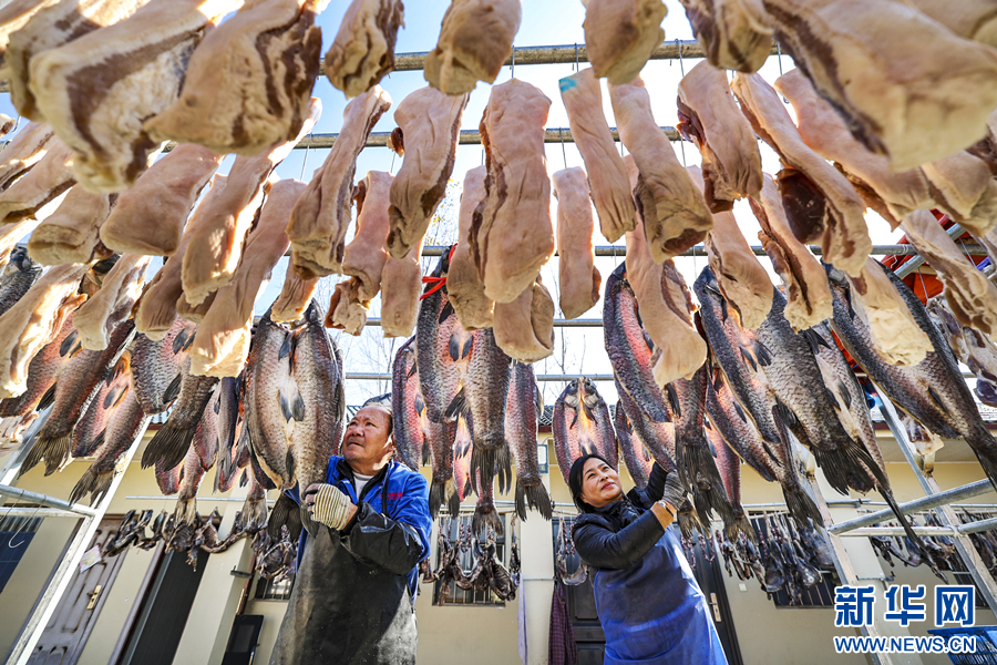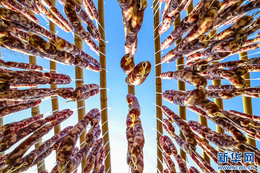 近日,安徽省马鞍山市博望区居民趁着气温低、天气好,制作、晾晒香肠、腊肉、腊鱼、腊鸡、腊鹅等传统腊味食物,成为当地一道独特的风景线。新华网发(王文生 摄)