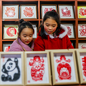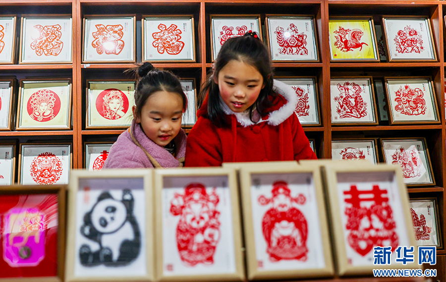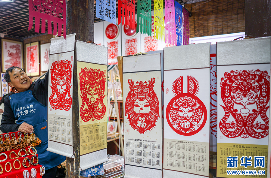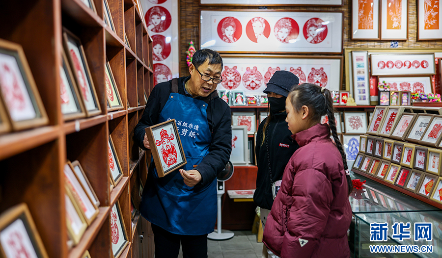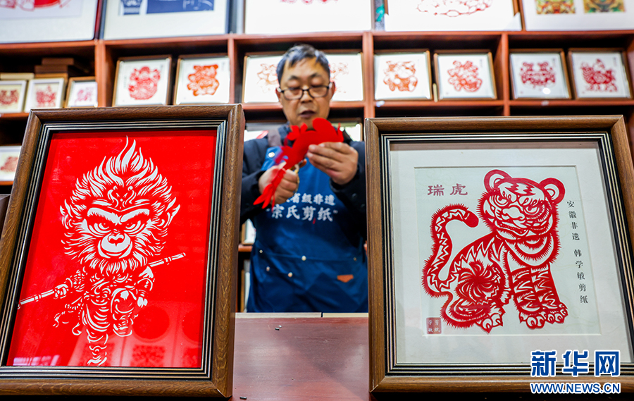 据了解,剪纸非遗传承人韩学敏入驻安徽省淮北市濉溪县古城石板街开设工作室,让传统剪纸艺术落地古城,非遗剪纸作品的生动趣味性满足了群众的审美和装饰需求,深受游客们的青睐。新华网发(王文 张明菊 摄)