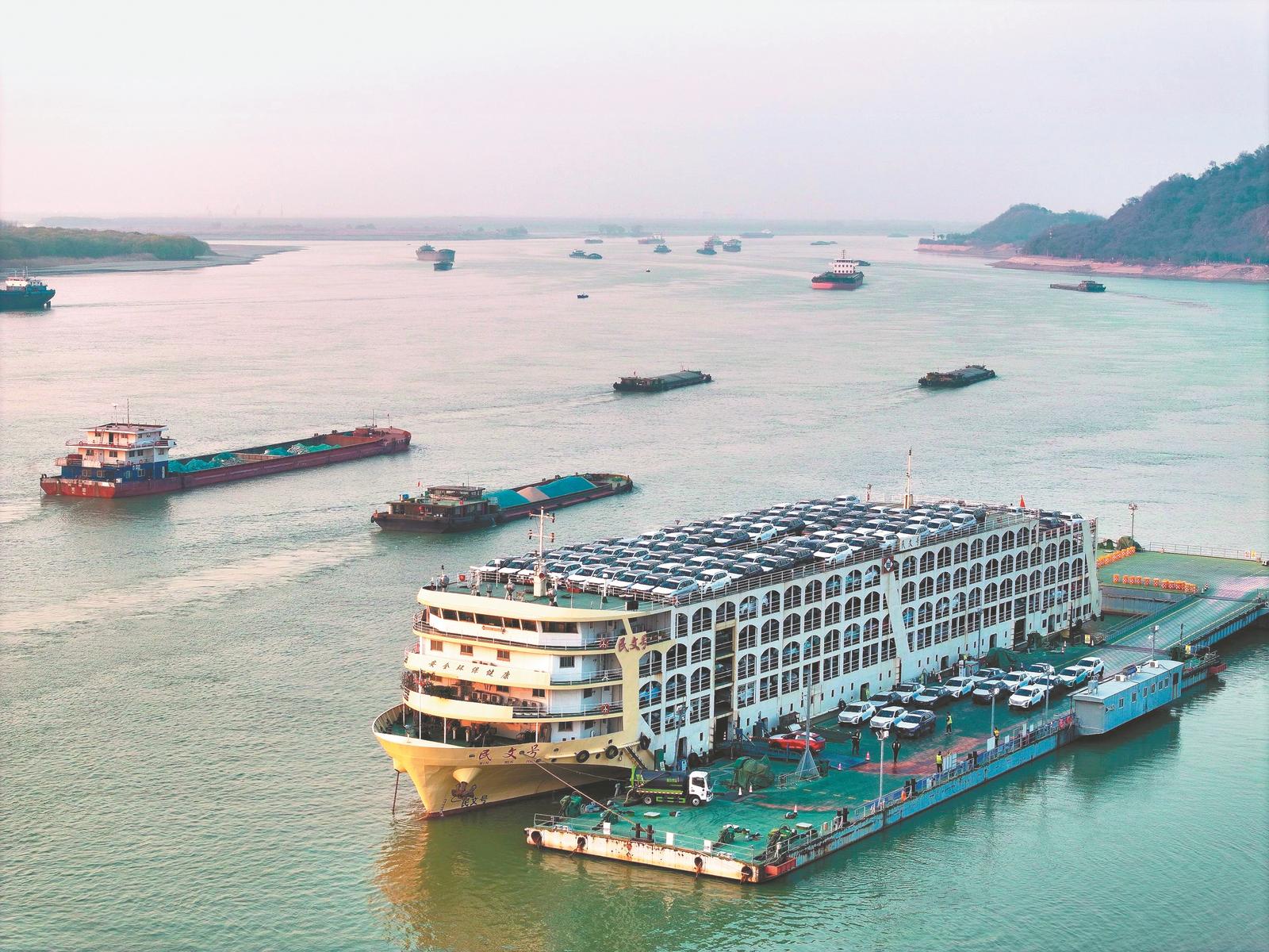 近日,安徽港口集团芜湖港朱家桥港区,一艘滚装货轮正在装载出口海外的汽车。通讯员 王玉实 梁浩 摄