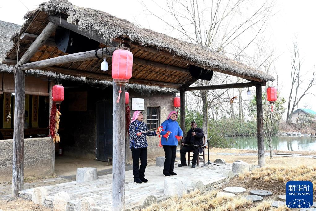 2025年1月24日,在小岗村“当年农家”景区,工作人员表演凤阳花鼓。新华社记者 黄博涵 摄