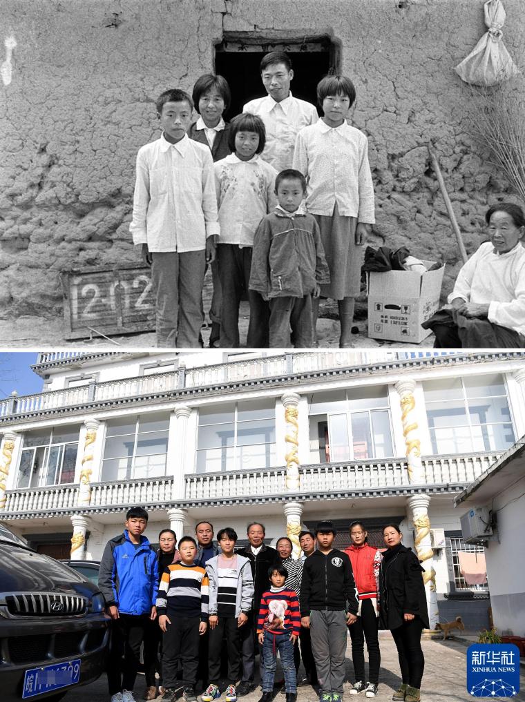 拼版照片:1982年,安徽省凤阳县小岗村“大包干”带头人严宏昌(后排中)在自家茅草房前和儿子严余山(左一)等合影(上图,资料照片);2018年11月28日,严宏昌(左六)在自家楼房前和儿子严余山(左四)及部分家人合影(下图,新华社记者刘军喜摄)。