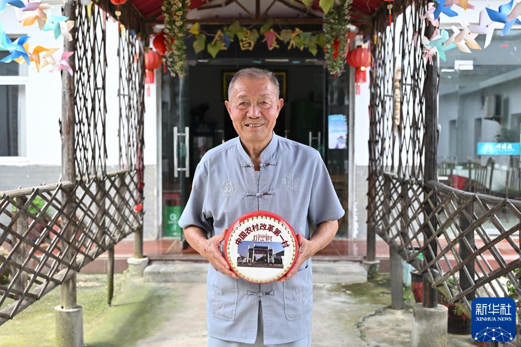2024年7月25日,小岗村“大包干”带头人严金昌在自家开办的农家乐里展示小岗村旅游纪念品凤阳花鼓。新华社记者 李鑫 摄
