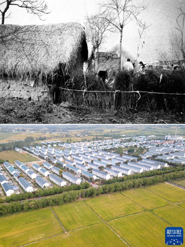 拼版照片:小岗村农民曾经居住的茅草屋(上图,资料照片);下图:2024年9月26日拍摄的小岗村新民居(下图,新华社记者张端摄)。