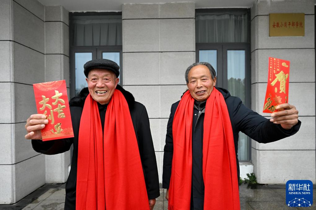 2025年1月25日,“大包干”带头人严金昌(左)和严宏昌在小岗村展示自家领取的分红“红包”。新华社记者 黄博涵 摄