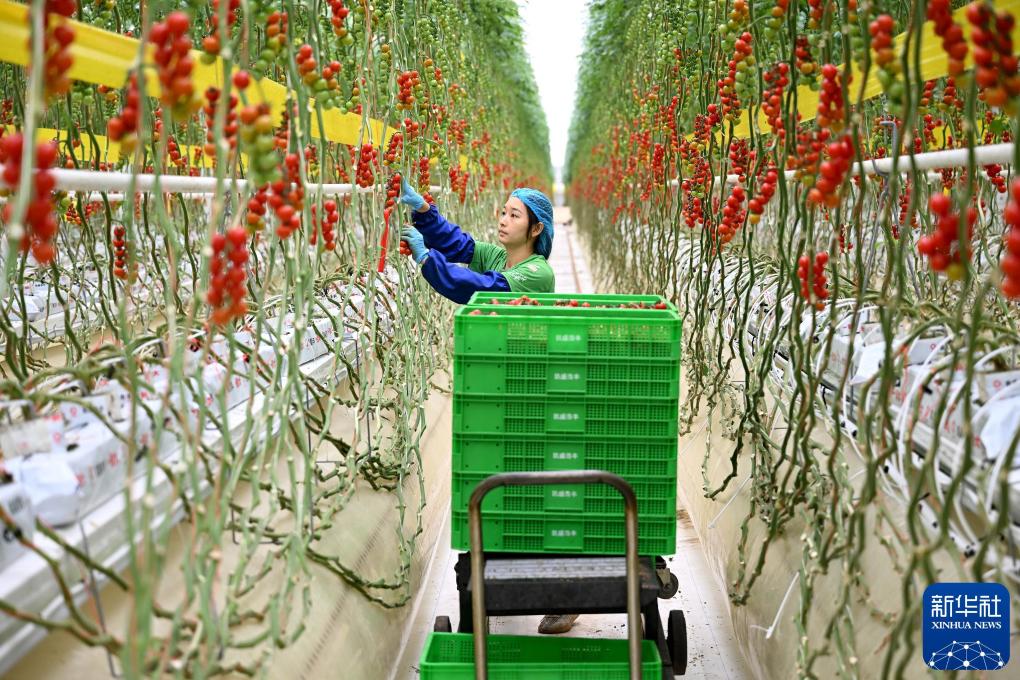 2025年1月23日,在凯盛浩丰(小岗)智慧农业产业园,工作人员在采摘番茄。新华社记者 黄博涵 摄