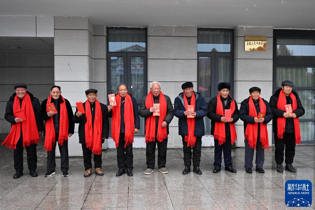 2025年1月25日,9位“大包干”带头人在小岗村展示自家领取的分红“红包”。新华社记者 黄博涵 摄